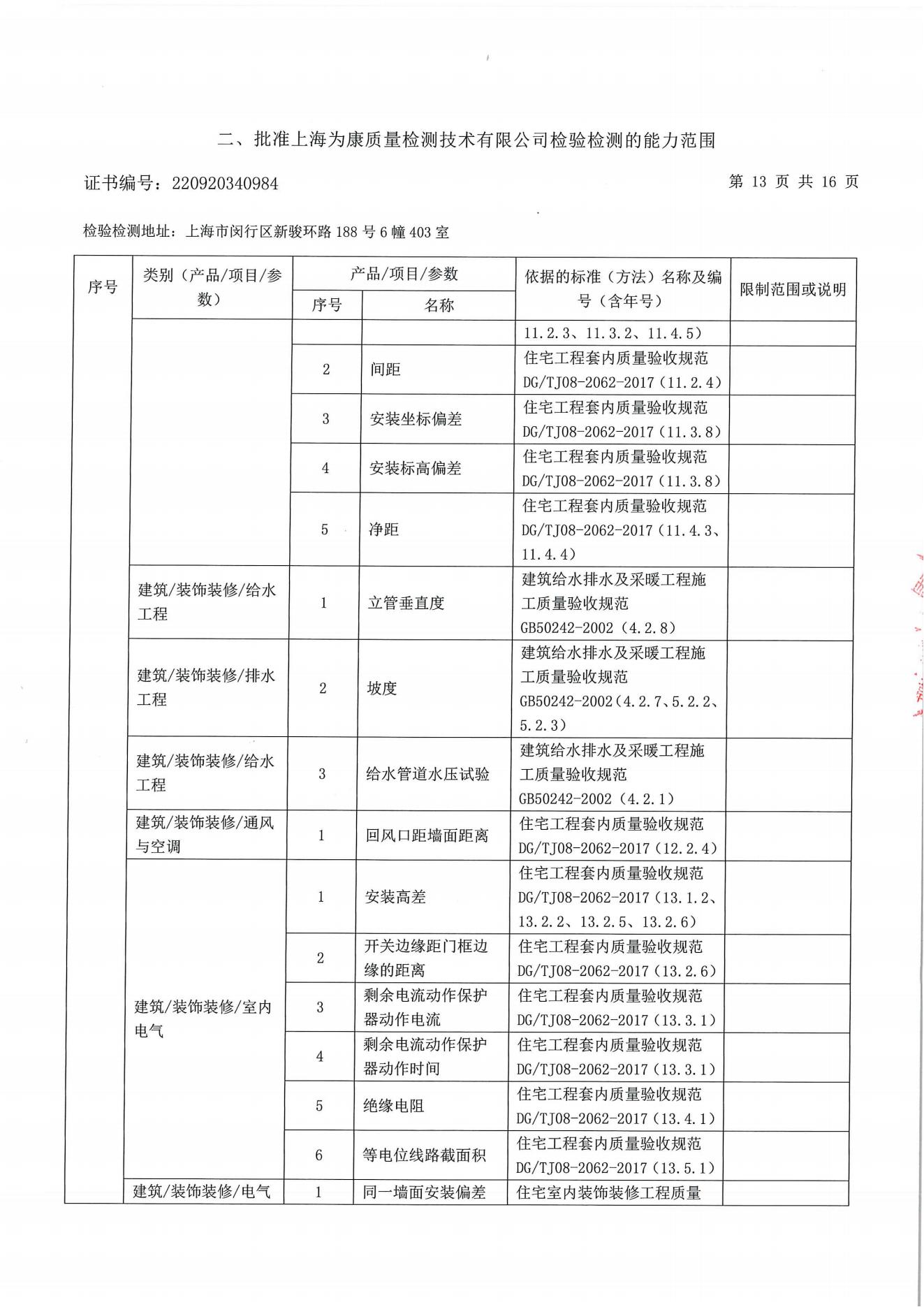 隨著經濟技術的發展,人們生活水平的提高,人們逐漸要提高和改善自己的居住和工作環境,在對居 住環境、辦公樓進行裝飾裝修時必然要采用大量的建筑和裝修材料,在美化室內環境的同時也帶來了 大量的污染物,這些室內環境中存在的污染物具有成分復雜、低濃度、接觸時間長、影響人群眾多和 產生健康影響的效應潛伏期長等特點。 為了保護室內人群的身心健康和促進員工的工作效率,國內外各單位和機構投入大量精力和財力進行 研究和實施達到室內人群可接受的室內污染物水平的措施和管理程序,為創造良好的樓宇室內環境質 量,針對室內污染的控制要素主要有:物理性指標、化學性指標、生物性指標和放射性指標四大類, 各主要要素的控制限值詳見下表(摘自《室內空氣質量標準》): 服務范圍: 1、個人家庭新房裝修污染空氣檢測。 2、學校、幼兒園等公共場所空氣檢測。 3、辦公室室內空氣污染檢測、甲醛檢測。 檢測依據及相關規定: 檢測依據:GB/T18883-2002《室內空氣質量標準》 檢測內容及限量標準: 室內環境質量評價標準 污 染 物 級 別 類 別 項 目 單 位 一 級 二 級 三 級 物理性指標 可吸入顆粒物 μg/m3 50 150 250 溫度 ℃ 23-26 23-26 21-23 21-23 濕度 % 50-60 55-65 40-50 >≤40 空氣流速 m/s <0.2 <0.25 <0.3 <0.15 <0.2 <0.2 噪聲 dB ≤45 ≤55 ≤65 ≤30 ≤45 ≤60 新風量 m3/h.人 60 30 15 化學性指標 甲醛 mg/m3 0.04 0.08 0.12 苯 μg /m3 10 20 30 二甲苯 mg/m3 0.03 0.60 0.90 TVOC μg /m3 200 300 600 苯并(α)芘 ng/m3 不得檢出 1 2 氨 mg/m3 0.1 0.2 0.5 CO2 ppm 600 1000 1500 CO mg/m3 3 5 10 O3 mg/m3 0.10 0.12 0.16 SO2 mg/m3 0.15 0.15 0.25 NO2 mg/m3 0.10 0.10 0.15 生物學指標 細菌總數 cfu/m3 1000 2000 4000 放射性指標 氡及其子體 Bq/m3 100 100 200 檢測周期: 自進場采樣后4-6工作日出具加蓋CMA(檢驗檢測授權專用章)檢測報告,具體報告周期視檢測量 及客戶實際要求為準。 檢測報告內容: 最終檢測報告包括以下內容: 1、工程概況; 2、檢測方法采用標準; 3、檢測使用設備; 4、檢測結果數據; 5、檢測報告編制、審核、批準人員信息; 6、檢測專用章及國家檢驗檢測機構授權專用章。 三、套內質量檢測(一房一驗) 分戶驗收要求 分戶驗收:即交房前依照相關標準對區域內住宅逐套進行驗收。自2009年10月1日起所有上海市 住宅工程強制實施分戶驗收?!渡虾J泄こ藤|量分戶驗收管理規定》住宅工程竣工驗收前必須依照《住 宅工程套內質量驗收規范》DG/TJ08-2062-2009和現行工程質量標準、規范,對每戶套內的觀感質 量、使用功能及使用安全進行驗收。凡未實施分戶驗收的,該工程項目將不得交付使用; 服務范圍 一、裝修房全過程跟蹤檢查:從毛坯到裝修結束全過程跟蹤檢驗;對隱蔽工程施工進行檢測;對裝飾 材料進行控制;每個施工節點作好原始記錄并提出整改意見;待整改結束進行復查,直至符合 要求;最終每戶出具一份檢測報告。 二、裝修房竣工驗收:主要對安全、使用功能及表面觀感質量進行檢測;每個施工節點作好原始記錄并提出整改意見;待整改結束進行復查,直至符合要求;最終每戶出具一份檢測報告。 三、毛坯竣工驗收:主要對安全、使用功能及表面觀感質量進行檢測;每個施工節點作好原始記錄并提出整改意見;待整改結束進行復查,直至符合要求;最終每戶出具一份檢測報告。 四、個人交房驗房檢測。 建設工程分戶驗收檢測參考標準 DG/TJ08-2062-2017 《住宅工程套內質量驗收規范 》 DB/T 31/30-2003《住宅裝飾裝修驗收標準》 GB50209-2002《建筑地面工程施工質量驗收規范》 GB50210-2001《建筑裝飾裝修工程質量驗收規范》 GB20242-2002《建筑給排水及采暖工程施工質量驗收規范》 GB50300-2001《建筑工程施工質量驗收統一標準》 GB50303-2002《建筑電氣工程施工質量驗收規范》 套內質量檢測(一房一驗)內容 檢測內容 建筑尺寸 室內地面:水泥砂漿地面、木、竹地板,板塊地面 室內頂棚:頂棚抹灰、吊頂工程 室內墻面:墻面抹灰、飾面板(磚)墻面、涂飾工程、裱糊工程、軟包工程 建筑門窗 樓梯與護欄 細部工程:櫥、柜,窗簾盒、窗臺板、門窗套、可折裝式隔斷、淋浴房 給排水與燃氣:室內給水、室內排水、衛生器具、燃氣管道 通風與空調:送排風和防排煙、空調工程、 室內電氣:燈具安裝、開關、插座,分戶配電箱、室內配線、等電位聯結 弱電工程:有線電視安裝工程、電話、信息網絡安裝工程,訪客對講安裝工程、安防報警系統 太陽能熱水系統 室內環境評價 四、空調與通風系統檢測 1、服務范圍 通風與空調系統風系統、水系統檢測; 通風與空調機組各功能段性能檢測; 通風與空調管道性能檢測; 空調房間室內環境檢測; 通風與空調系統節能性評價,通風與空調系統報監檢測。 2、檢測依據 GB50411-2007 《建筑節能工程施工質量驗收規范》 GBT19232-2003 《風機盤管機組》 GBT14294-1993 《組合式空調機組》 DG/TJ08-802-2005《通風與空調系統性能檢測規程》 DG/TJ 08-802-2005《通風與空調系統性能檢測規程》 GB 50243-2002《通風與空調工程施工及驗收規范》 GB 50411-2007《建筑節能工程施工質量驗收規范》 3、通風與空調系統檢測注意事項 1、通風與空調系統檢測進場前須要提供設計說明圖紙、主要設備參數表、風管、風口、水管布置圖; 2、通風與空調系統檢測進場前,系統應運行穩定一段時間,標準時間8小時,適當可減少; 3、通風與空調系統檢測進場時,需